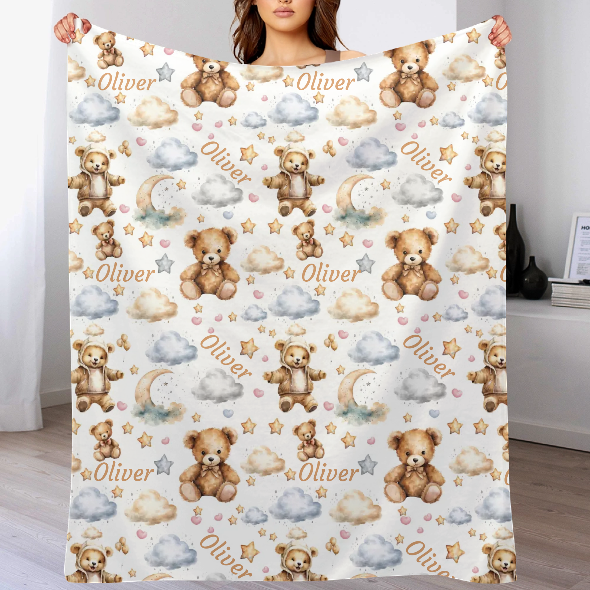 Personalized Watercolor Teddy Bear Swaddle Blanket