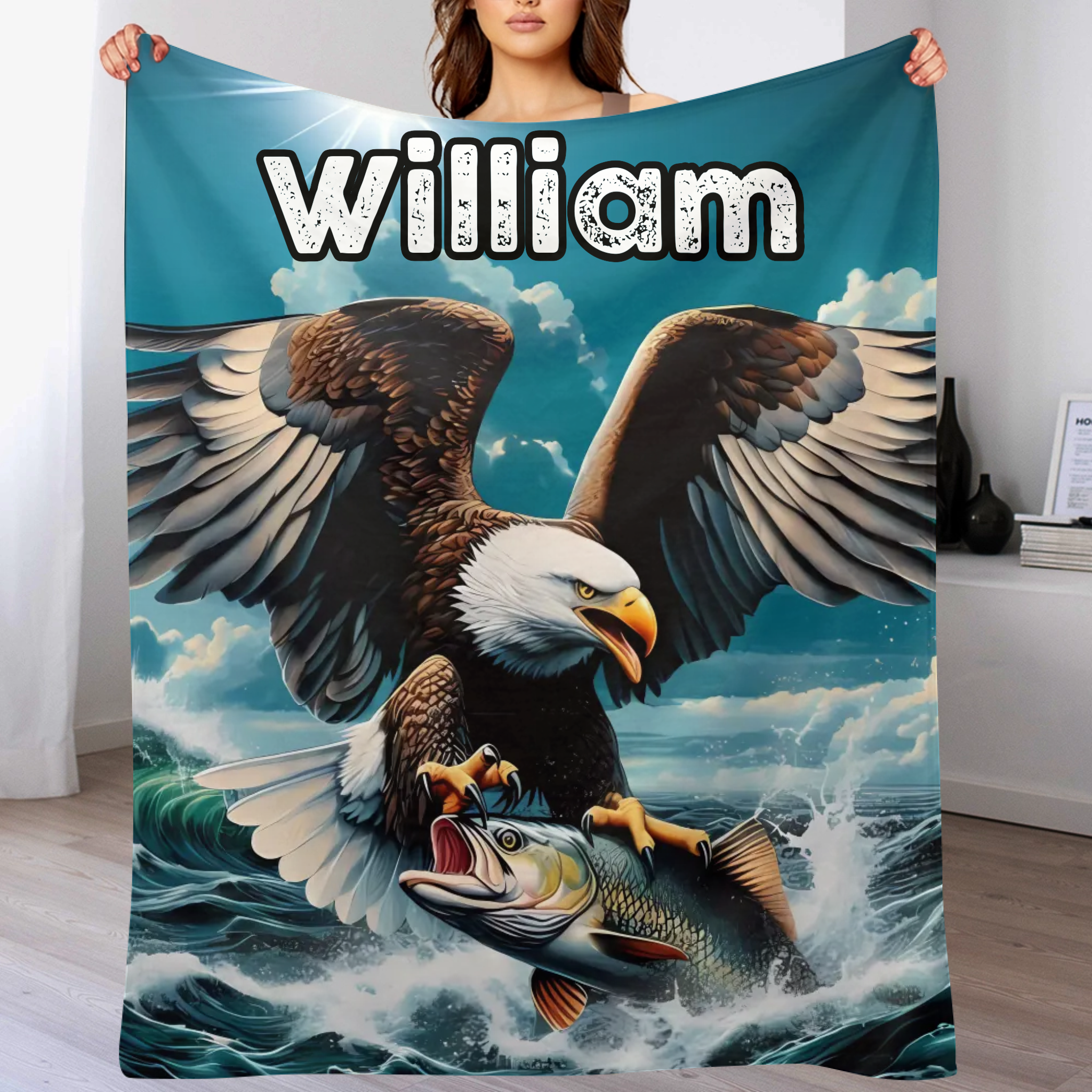 Customized Eagle Themed Blanket - Personalized Name Eagle Catching Fish Blanket - A Gift For Bird Lover,Eagle Lover,Friend,Colleagues