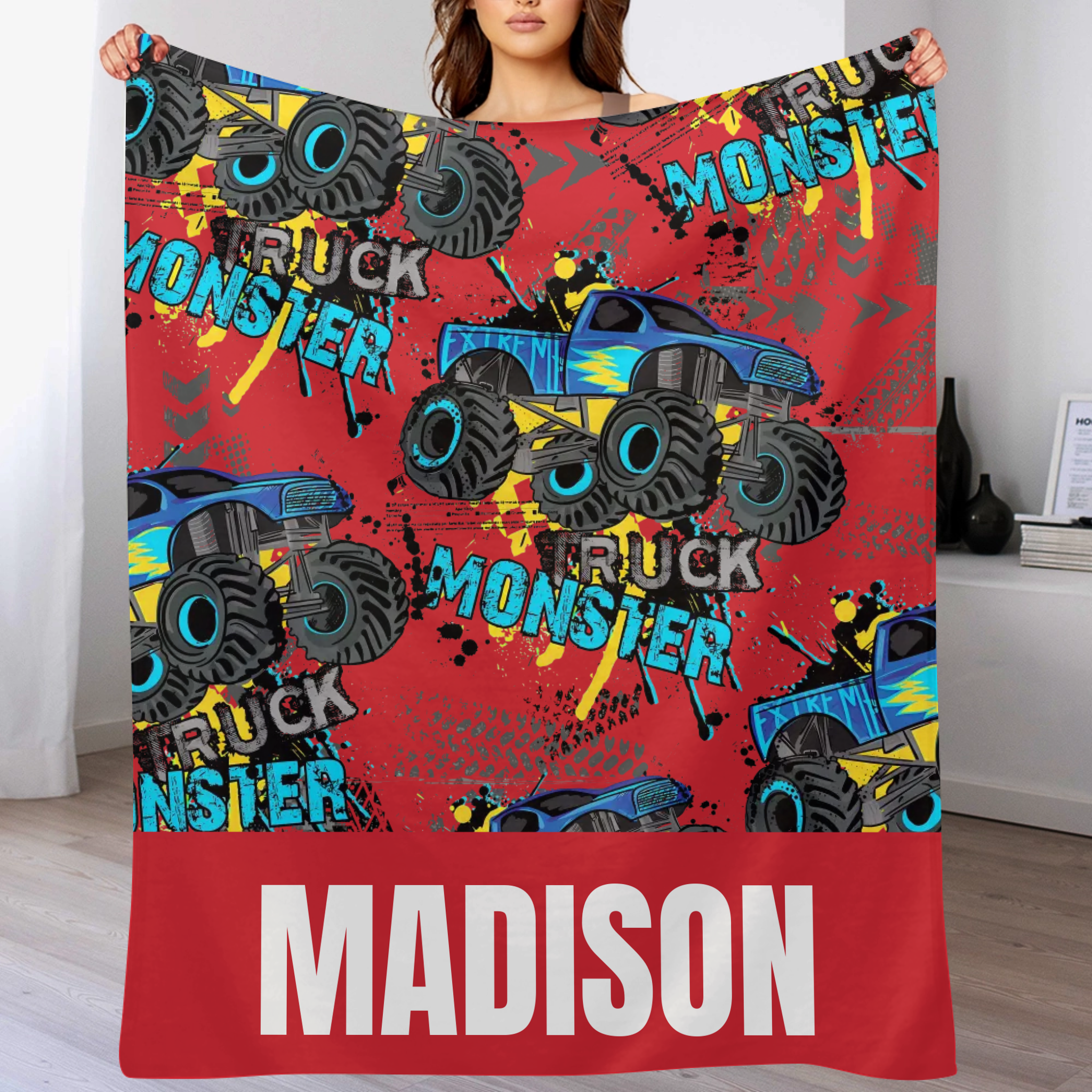 Personalized Monster Truck Name Custom Blanket, Customized Kids Birthday Gift Ideas