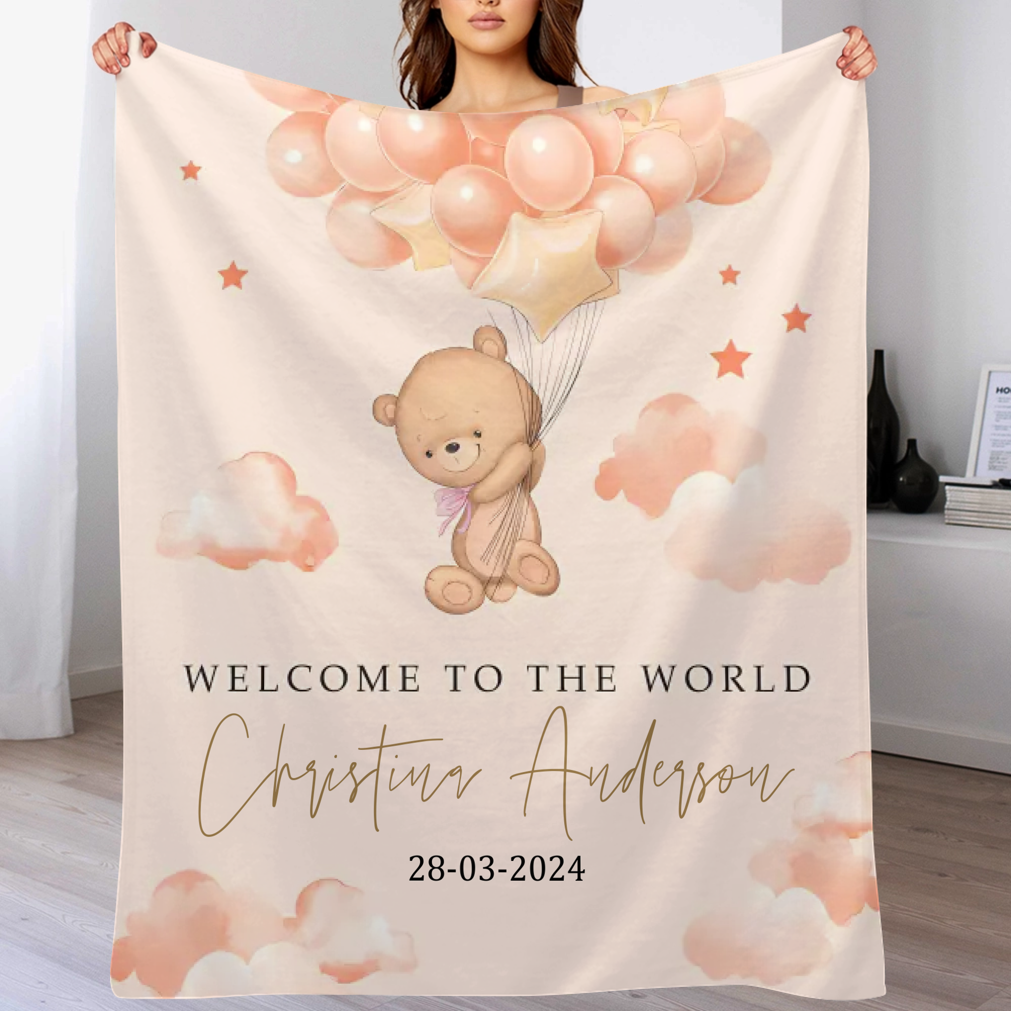 Teddy Bear Custom Colour Blanket - Personalised Name And Date Of Birth Blanket - A Gift For Child,Newborns,Baby