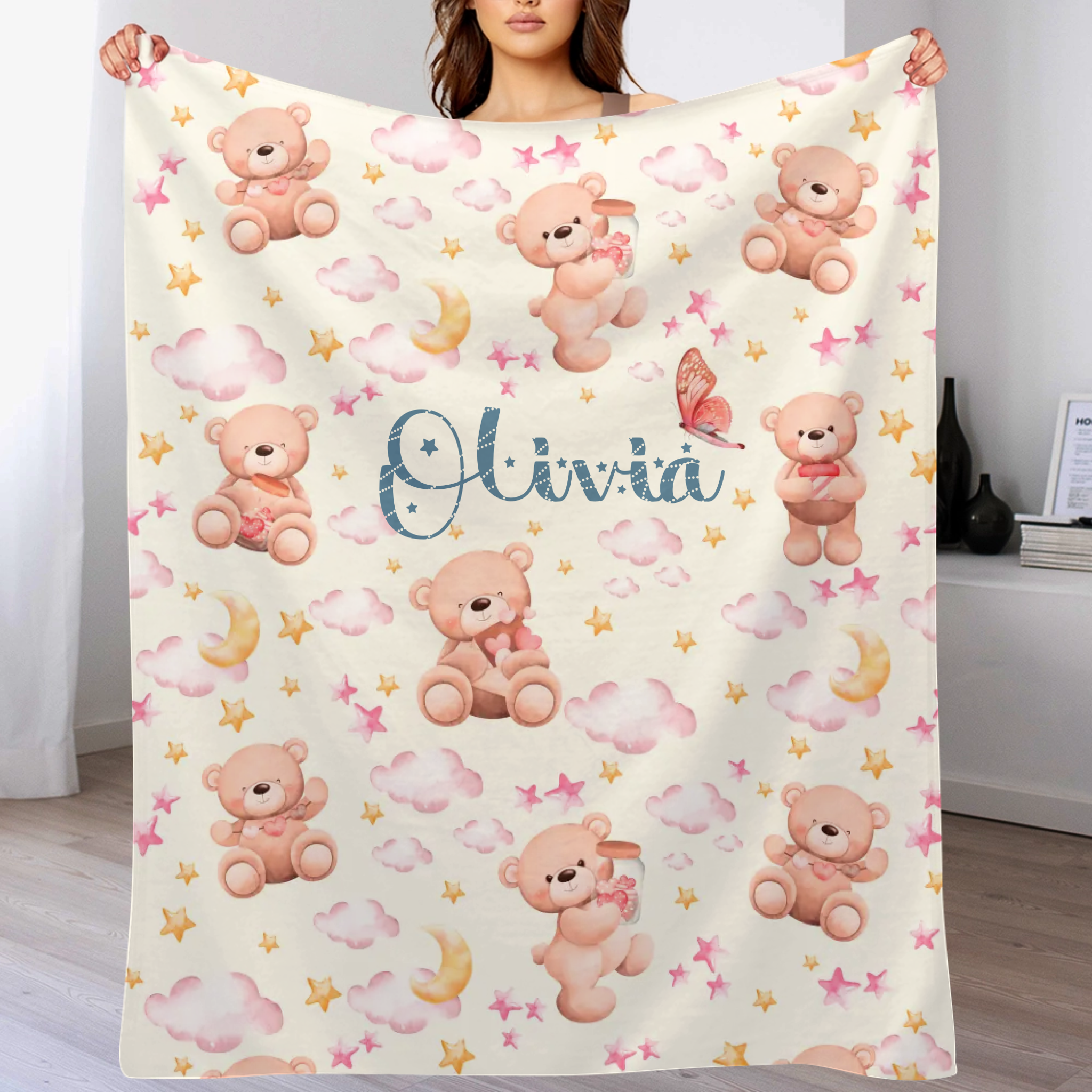 Personalized Name Baby Toddler Blanket For Girls - Pastel Colors, Bears, Stars, Clouds, Gift for Newborn