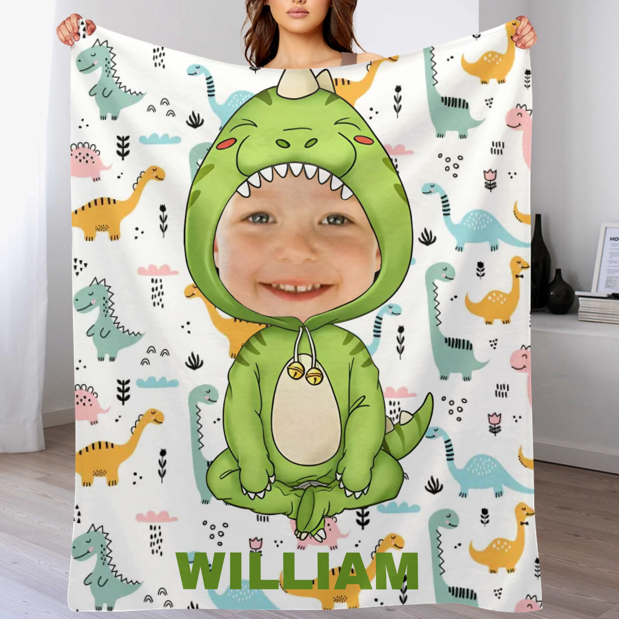 Customised Dinosaur Blanket - Personalised Name and Photo Dinosaur Clothes Pattern Blanket - A Gift For Children,Grandchildren,Boy,Girl,Dinosaur Lovers
