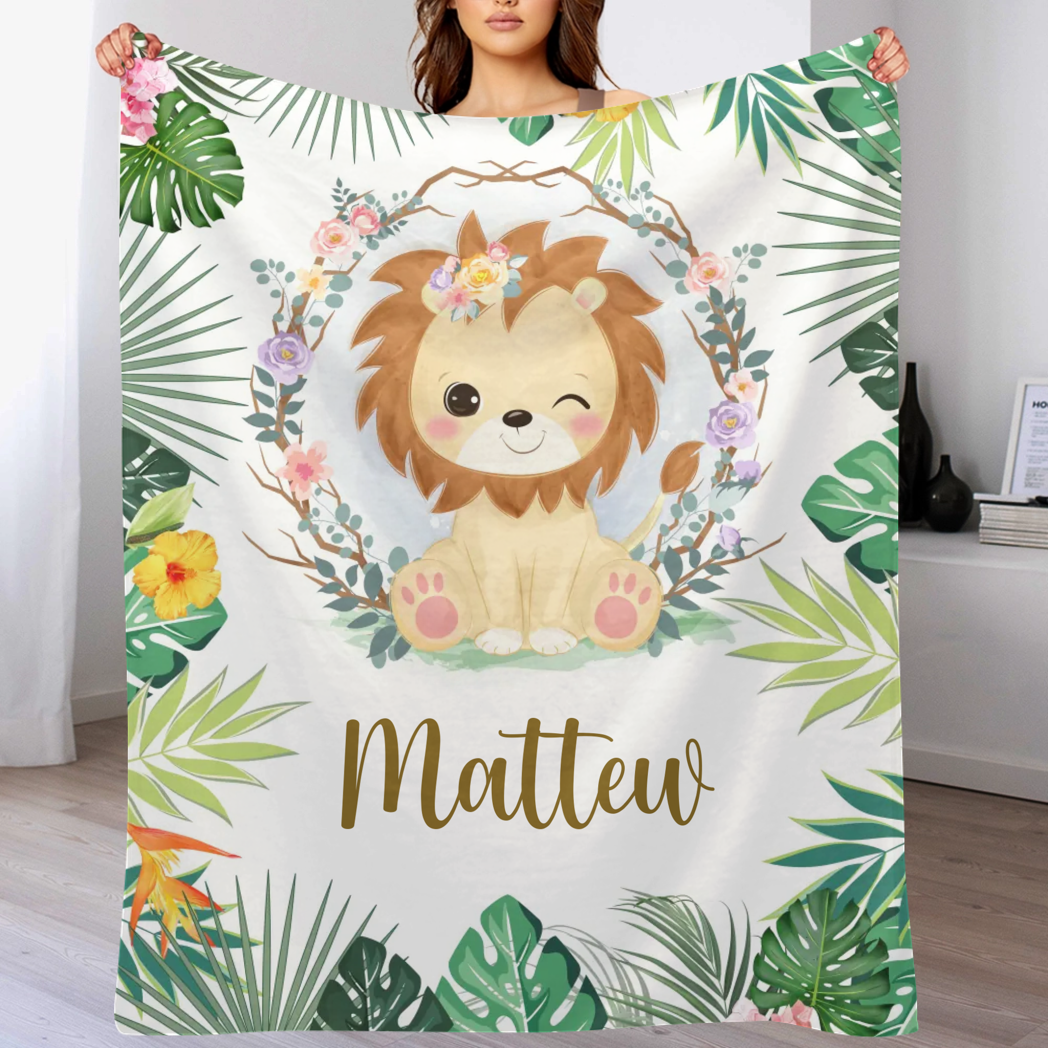 Personalized Lion Cub Wearing Flowers Blankets for Girls Boys - Customized Baby Gifts with Name