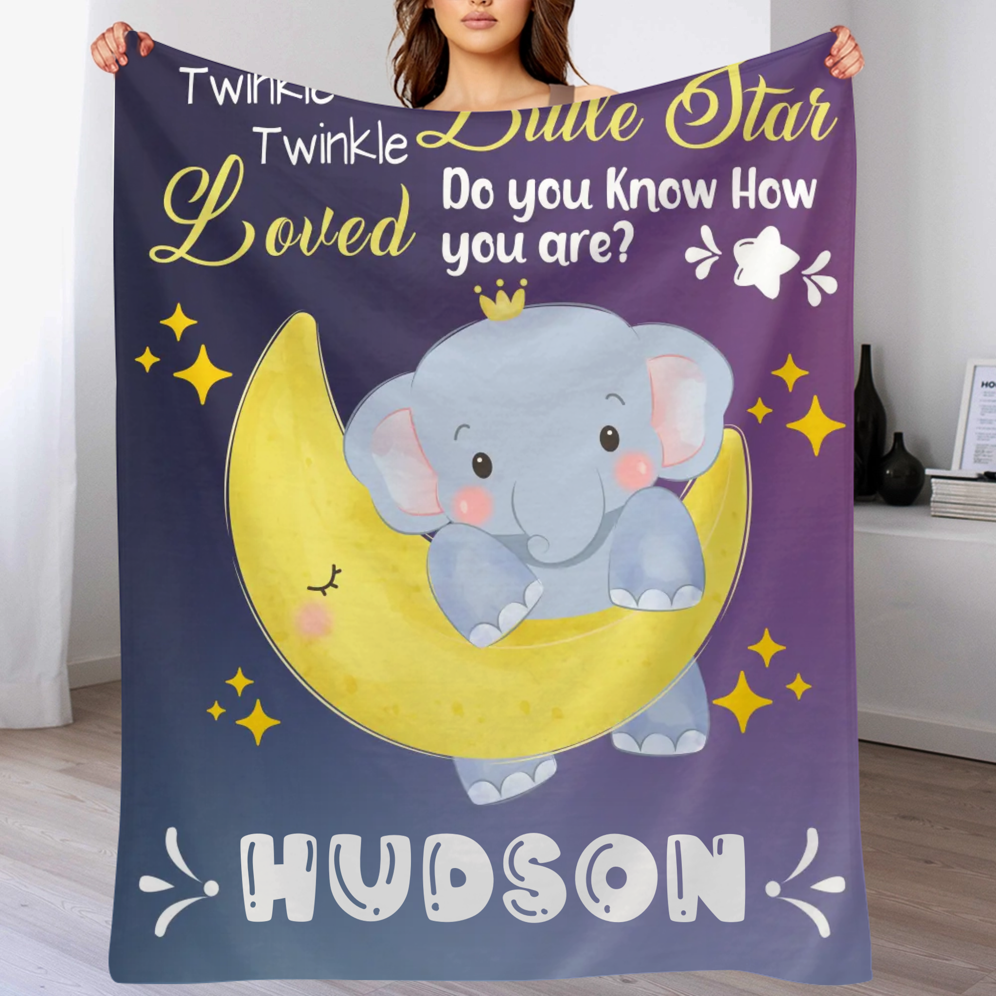 Personalized Baby Blankets for Boys Girls - Twinkle Little Star Baby Elephant On Moon