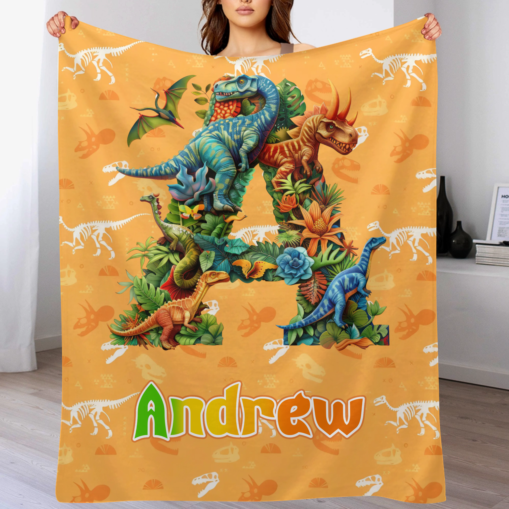 Custom Alphabet Dino Blanket – Personalized Dinosaur Letter Nursery Throw – Gift for Kids & Babies