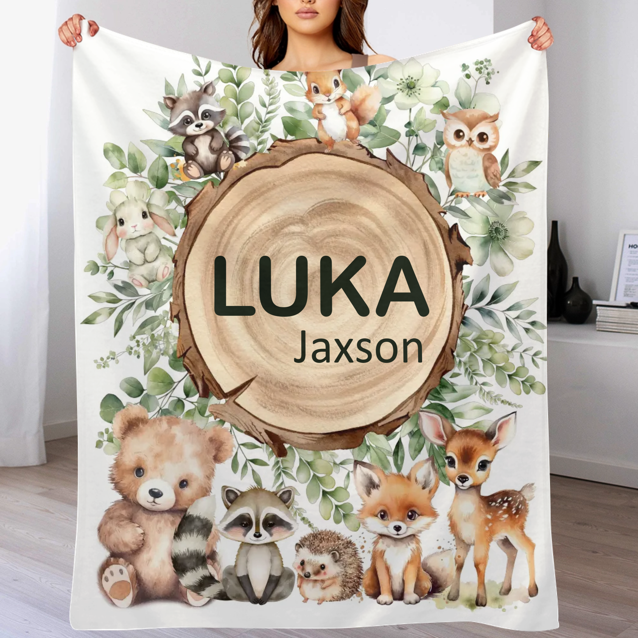 Woodland Stump Announcement Small Animal Friends Baby Name Blanket - Forest Animals Bear Fox Raccoon Deer