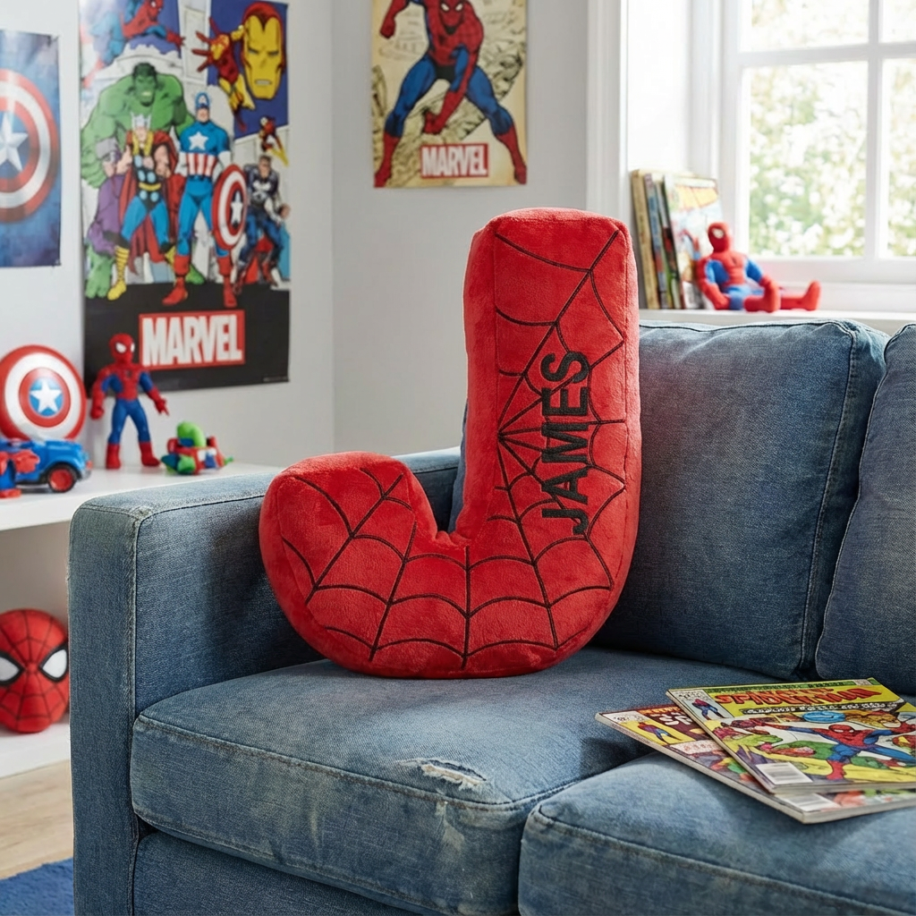 Custom Spider Web Letter Pillow – Personalized Hero Initial Cushion – Gift for Kids