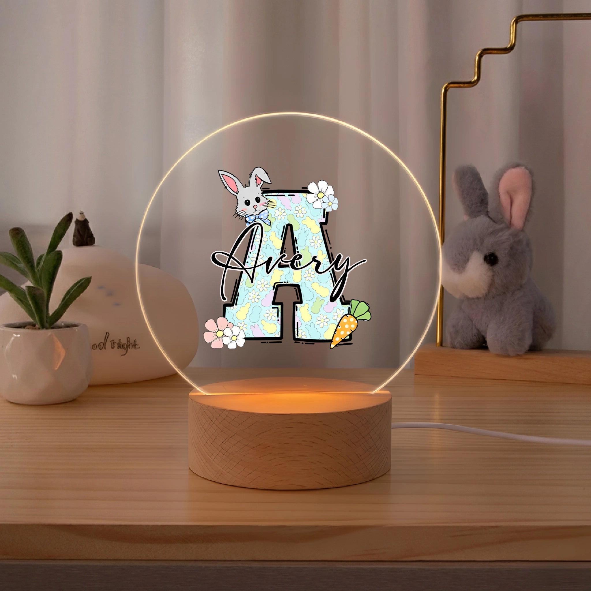 Custom Bunny Carrot Initial Night Light - Personalized Easter LED Lamp with Name - Gift for Kids