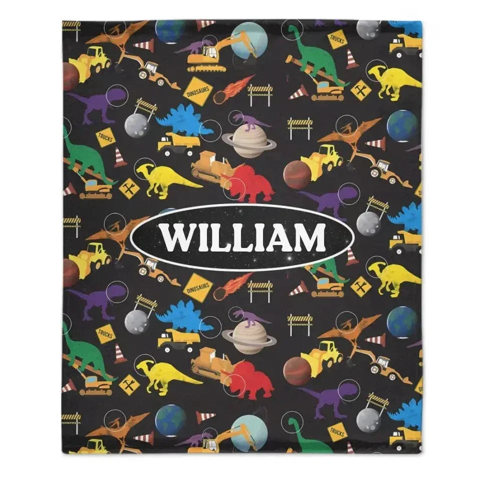 Construction Trucks Planet Dinosaurs in Space Blanket