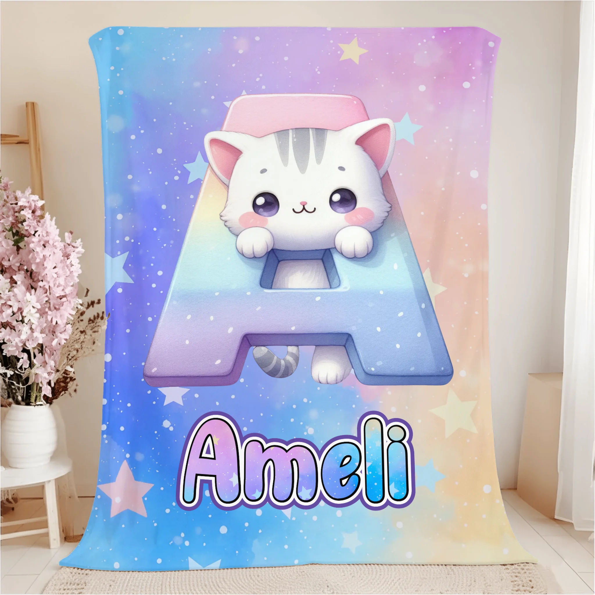 Custom Cat Blanket with Name - Personalized Kids Initial Throw - Gift for Daughter Son Birthday