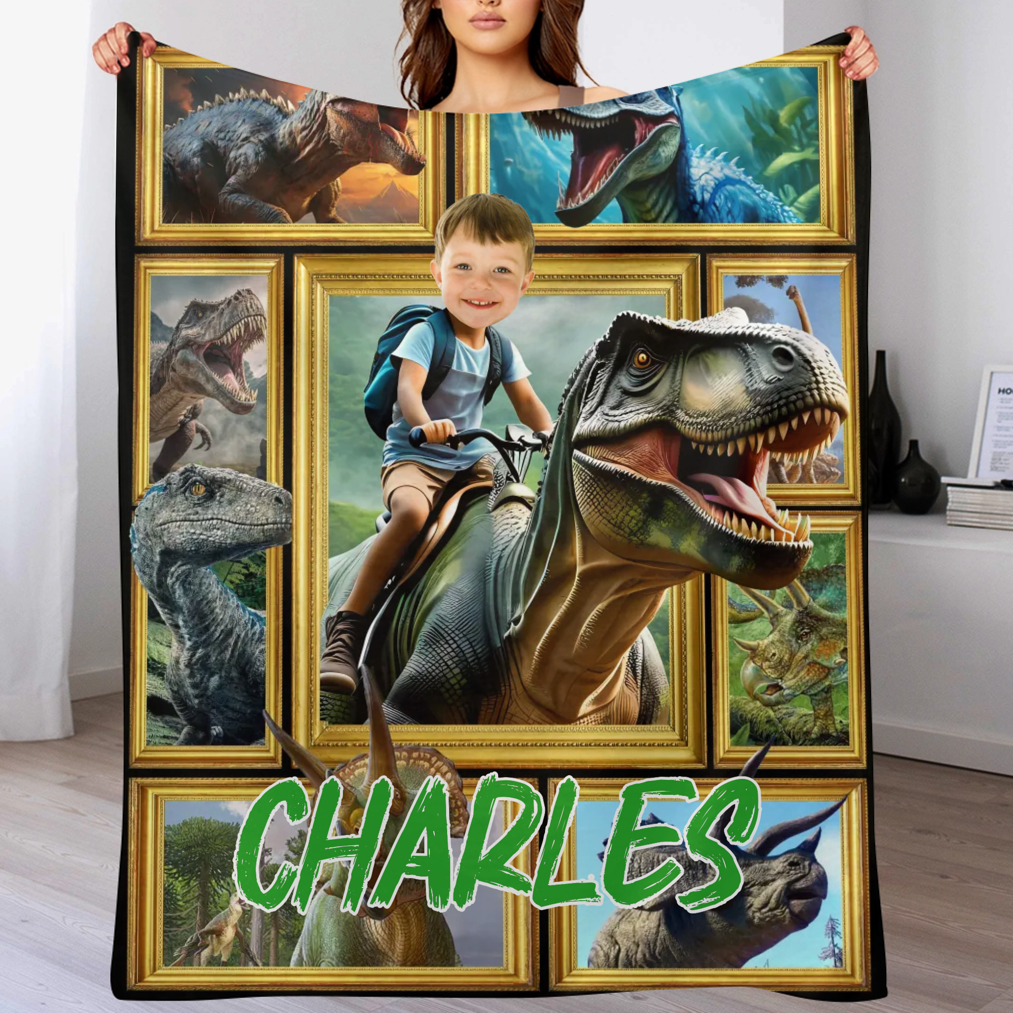 Customized Dinosaur Blanket - Personalized Name and Photo Riding Dinosaur Themed Flannel Blanket - A Gift For Children,Boy,Classmate