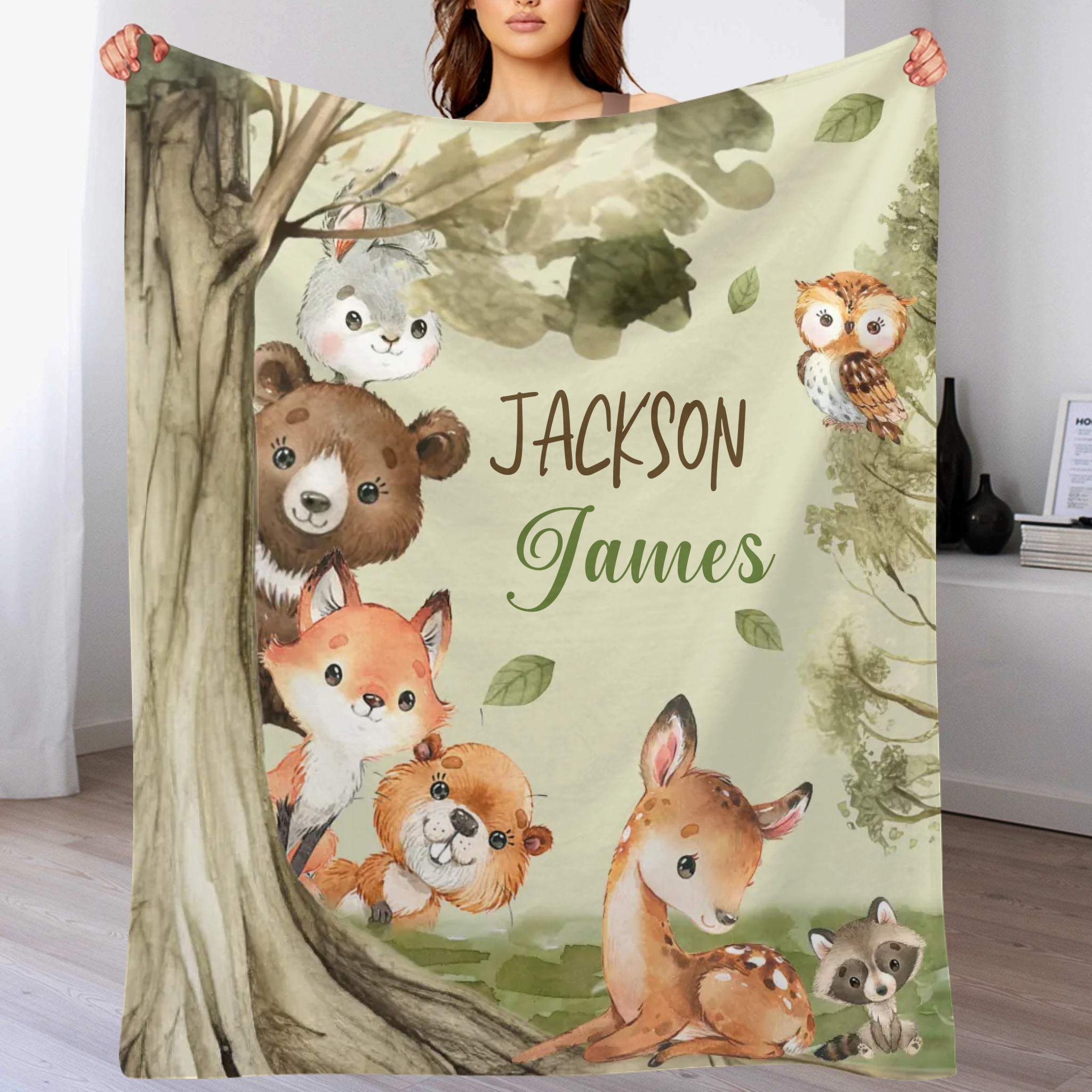Woodland Animal - Personalised Name Animal Print Blanket - A Gift For Child